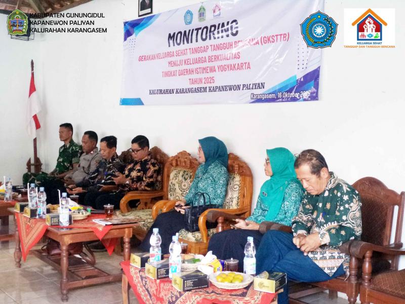 Karangasem-Paliyan (Sida, 17 Oktober 2025) Monitoring Gerakan Keluarga Sehat Tanggap Tangguh Bencana (GKSTTB) Tingkat Daerah Istimewa Yogyakarta di Aula Kalurahan Karangasem kapanewon paliyan (Kamis, 16/10). Dihadiri oleh Ketua TP PKK Kabupaten Gunungkidul, Rr. Listya Wardhani, Kepala Perangkat Daeerah terkait di Lingkungan Kabupaten Gunungkidul, Yayasan Karinakas DIY, Forkompimkap Kapanewon Paliyan, Ketua TP PKK Kapanewon Paliyan, TP PKK Kalurahan, MoU BRIN, UPT Puskesmas Paliyan, KUA, PLKB Paliyan, Koordinator PKH, Lurah Karangasem beserta Pamong Kalurahan, serta ibu-ibu Kader Kalurahan Karangasem.