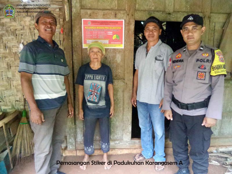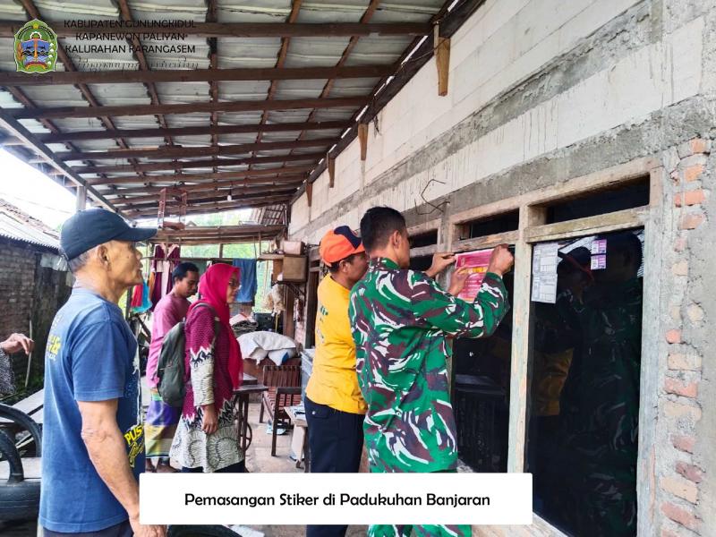 Karangasem-Paliyan, (17 Desember 2025) Aksi pemasangan stiker penanda status Keluarga Miskin/Prasejahtera (KPM) penerima Bantuan Sosial (Bansos) di wilayah Karangasem kembali dilanjutkan, meliputi Padukuhan Karangasem A, Banjaran dan Padukuhan Manggul. Kegiatan ini merupakan langkah lanjutan pemerintah Kalurahan untuk memastikan transparansi dan akuntabilitas penyaluran Bansos agar tepat sasaran. Pelaksanaan di lapangan dibagi menjadi dua tim yang dikoordinasikan secara terstruktur dengan melibatkan berbagai pihak. Tim 1 yang bertugas di Padukuhan Banjaran dipimpin oleh Dukuh Murtoyo, didampingi oleh Babinsa Karangasem, Pendamping Program Keluarga Harapan (PKH), serta Kamituwa Karangasem, Karsiyem, S.E., disaksikan RT dan RW kedua Tim.
