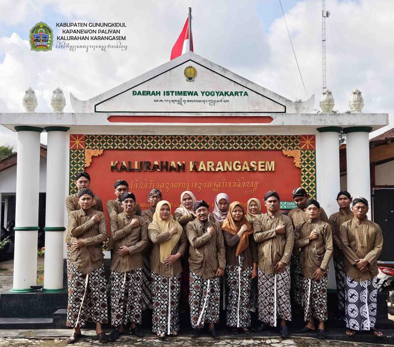 Karangasem-Paliyan (05 Februari 2026) Ada pemandangan yang tak biasa saat melangkah masuk ke Kantor Kalurahan Karangasem pada Kamis Pon ini. Suasana perkantoran yang biasanya formal dengan seragam dinas harian, kini berubah drastis menjadi kental dengan nuansa budaya (Kamis Pon, 05/02). Lurah Karangasem, Sigit Purnomo, tampak bersahaja memimpin jajarannya dengan mengenakan pakaian tradisional Jawa lengkap, atau yang dikenal dengan Gagrak Ngayogyokarto. Transformasi penampilan para pamong ini seketika membawa nuansa keraton yang adiluhung ke dalam ruang pelayanan publik.
