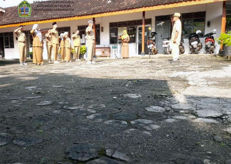 Karangasem-Paliyan (Sida, 9 Maret 2026 ) Apel Senin Rutin Lurah dan Pamong Kalurahan Karangasem Kapanewon Paliyan, di Halaman Kantor Kalurahan. dihadiri Lurah Karangasem, Sigit Purnomo, dan Pamong Kalurahan.
