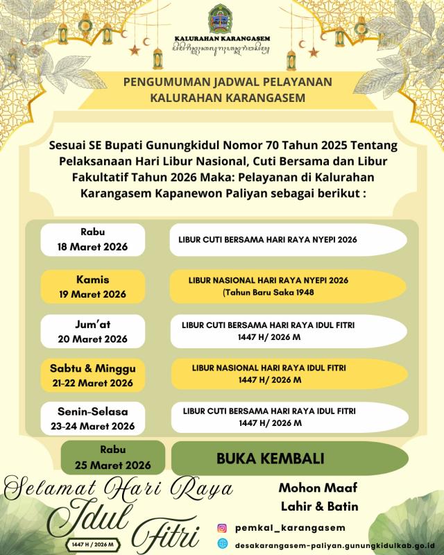 Karangasem-Paliyan (Sida, 17/03/2026) Sesuai Surat Edaran Bupati Gunungkidul Nomor 70 Tahun 2025 tentang pelaksanaan Hari Libur Nasional, Cuti Bersama, dan libur Fakultatif Tahun 2026, maka Jadwal Pelayanan Kalurahan Karangasem Kapanewon Paliyan tutup pada tanggal 18 Maret 2026 sampai dengan 24 Maret 2026. Pelayanan akan dibuka kembali pada tanggal 25 Maret 2026.