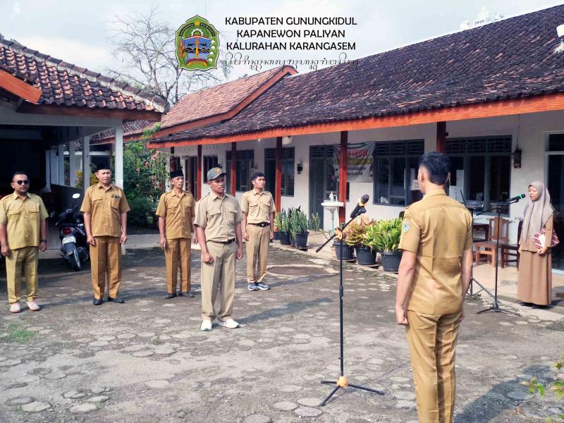 Karangasem-Paliyan (Sida, 06 April 2026) Apel rutin Lurah dan Pamong Kalurahan Karangasem Kapanewon Paliyan di Halaman Kantor Kalurahan ( Senin, 06/04). Selaku Pimpinan Apel pagi ini, kasi Ulu-Ulu Karangasem, Endi Septo. Dalam amanatnya, Endi memohonkan ijin untuk Lurah Karangasem belum bisa mengikuti Apel pagi, karena sedang Takziah. Endi mengajak kepada seluruh Pamong Kalurahan untuk terus semangat dalam melaksanakan Tugasnya masing-masing dan tetap menjaga kesehatan serta kedisiplinan.