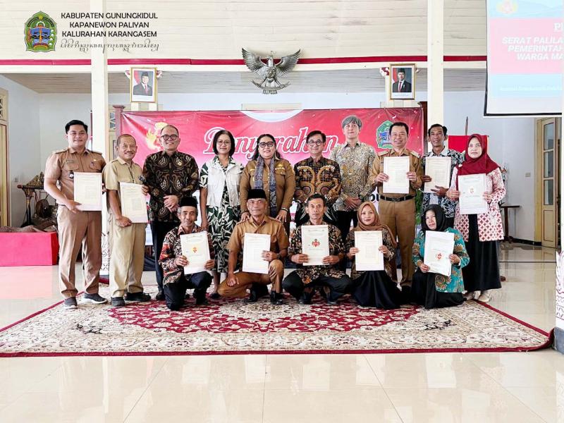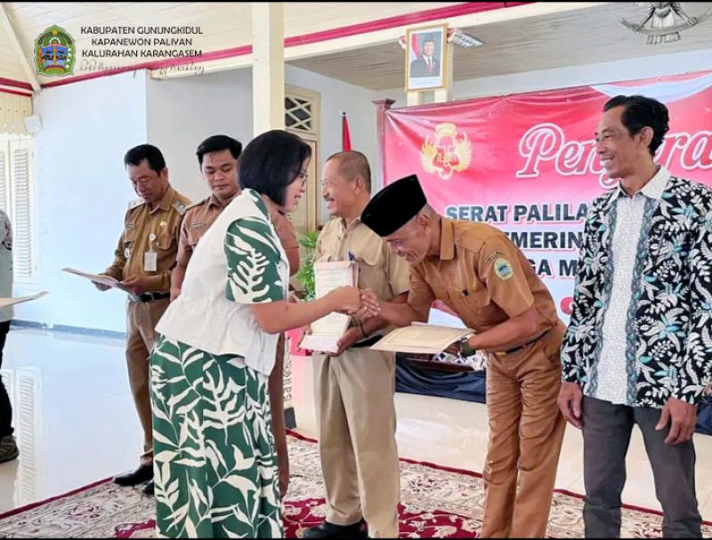 Karangasem-Paliyan (Sida, 06 April 2026) Penyerahan 72 Serat Palilah dan Kekancingan untuk Kalurahan Karangasem di Kabupaten Gunungkidul oleh GKR Mangkubumi di Bangsal Sewokoprojo Kapanewon Wonosari diterima Lurah Karangasem Sigit Purnomo, didampingi Dukuh Karangasem B, Sunarman, serta warga pemanfaat Tanah Sultan (Sultan Ground). Acara ini dipimpin langsung oleh Gusti Kanjeng Ratu (GKR) Mangkubumi selaku Penghageng Kawedanan Ageng Punakawan Datu Dono Suyoso Keraton Ngayogyakarta Hadiningrat. Turut mendampingi dalam prosesi tersebut, Bupati Gunungkidul Endah Subekti Kuntariningsih, jajaran Forkopimda, Kepala Kanwil ATR/BPN DIY Sepyo Achanto, serta Kepala Dinas Pertanahan dan Tata Ruang DIY Bayu Kristianto.